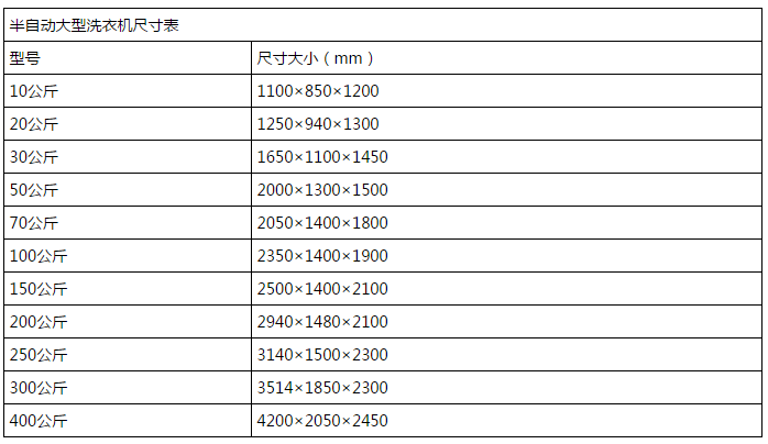 半自動工業(yè)洗衣機尺寸大小:目前市場中的半自動工業(yè)洗衣機,從容量10公斤至400公斤有多個規(guī)格,不同的容量,相應的周身體積也是不同的。雖說不同的廠家在產(chǎn)品質(zhì)量、性能控制上略有差異,但產(chǎn)品的尺寸卻是大同小異的,下表就上海力凈為大家羅列出了10至400公斤不同容量的半自動工業(yè)洗衣機的尺寸大小表。